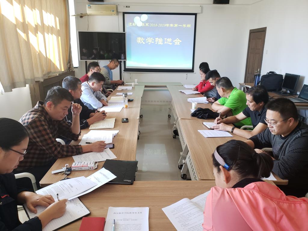 本网讯 10月10日下午2点半,我系2018-2019学年第1学期教学工作推进会在运动训练系会议室召开,系主任张葆欣、副主任武洛生、黄谦出席,各教研室主任、副主任、各年级办主任及办公室工作人员参加了会议。