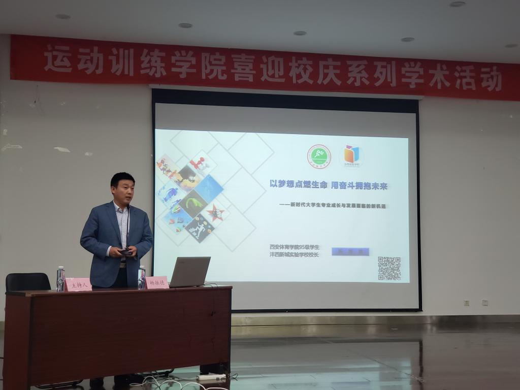 18日下午,我院校友,陕西省教学能手,西咸新区沣西实验学校校长杨振德在五楼报告厅为运动训练学院师生做了题为《新时代大学生专业成长与发展面临的新机遇》,此次专题讲座由运动训练学院党委书记王鑫主持。杨振德分析了新时代大学生面临的新机遇新挑战,结合自己的成长经历,号召广大师生清醒认识自我,牢固树立终身学习、终身完善、终身发展理念,珍惜父母给予的宝贵生命,珍惜学校良好的学习资源,珍惜老师们给予的智慧和技能,珍惜同学们之间深厚的情谊,突破自我,用诚厚俭朴、团结拼搏、勤奋刻苦、求实创新、爱国荣校的365官网精神,成就自己,绽放365官网人生命精彩。