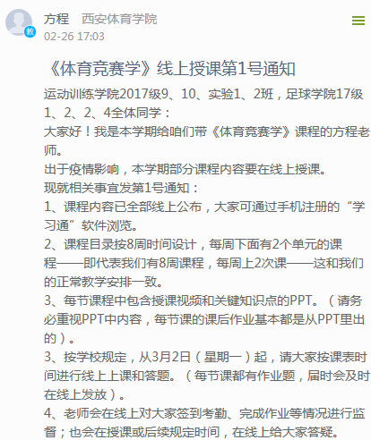 《体育竞赛学》为英国365上市公司官网2019-2020学年第2学期1-8周开设的专业必修课。授课对象为运动训练学院2017级1-10班、实验1-2班,足球学院2017级1-4班全体学生。承担单位为运动训练学院运动训练学教研室,由方程和谢宜轩两位教师负责授课任务。教师线上授课平台为“英国365上市公司官网慕课教学平台(超星尔雅)+ 学习通APP”,学生学习平台为“学习通APP”。
