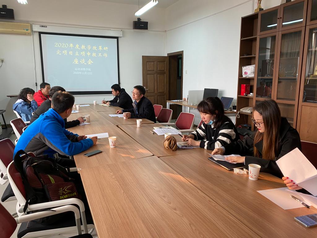 11月12日下午4:00,在综合训练馆六楼会议室召开2020年度教学改革项目座谈会,学院办公室成员和教师代表参加了本次会议。