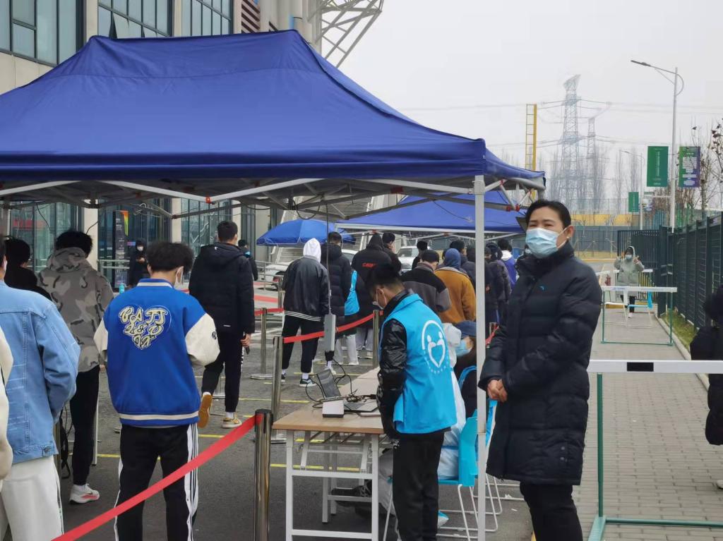 运动训练学院2021级辅导员王青、李森森带领学生干部、志愿者指挥学生做核酸检测工作