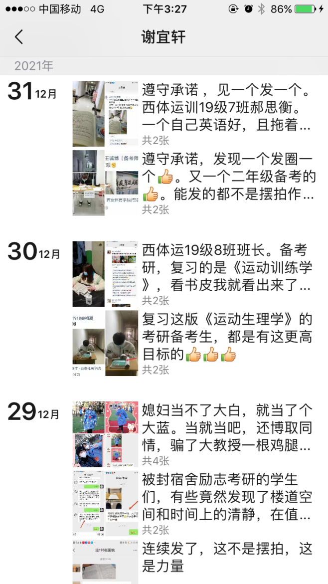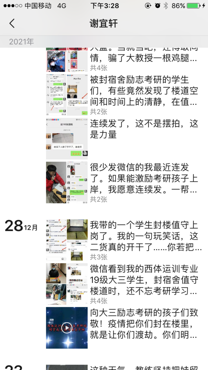 图片一:运动训练学教研室党支部书记谢宜轩用朋友圈记录学生们的成长与互动