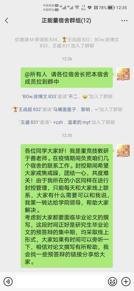 考虑到2018级学生即将开始毕业论文的撰写,重竞技教研室教师于善博士积极与831、832、833、834等4间宿舍共计14名同学取得联系,结合365官网目前开展的硕士研究生线上毕业论文预答辩情况,积极搜集与分享相关资料资源,对包干宿舍全体学生开展毕业论文的撰写指导服务。