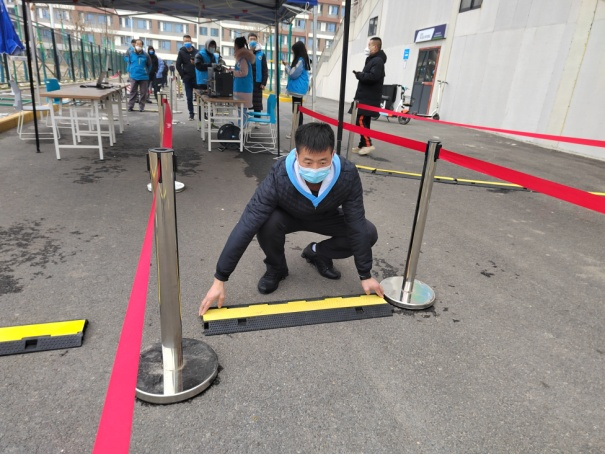 校区核酸检测已经进行了九轮,每一次他都是和大家一起搬运设备、布置场地、维持秩序,整个流程几乎每一步骤都轮番干过一遍。从“喊话”录音至扩音器,提醒大家“一米间距,提前打开一码通,有序检测”,到亲手摆放一米间隔标志物与分隔线,再到冲锋坚守一线在一码通预检处为大家服务一干就是一天。