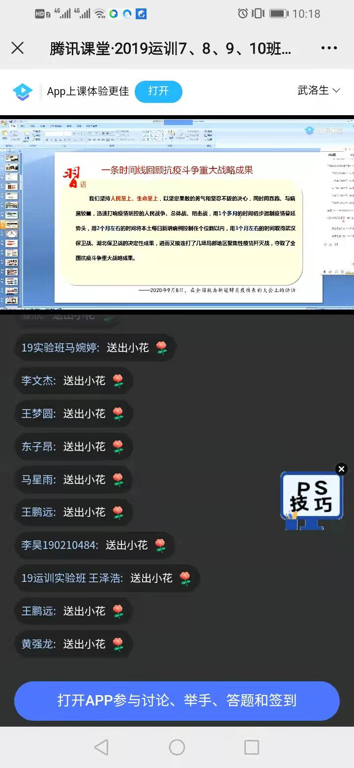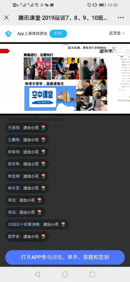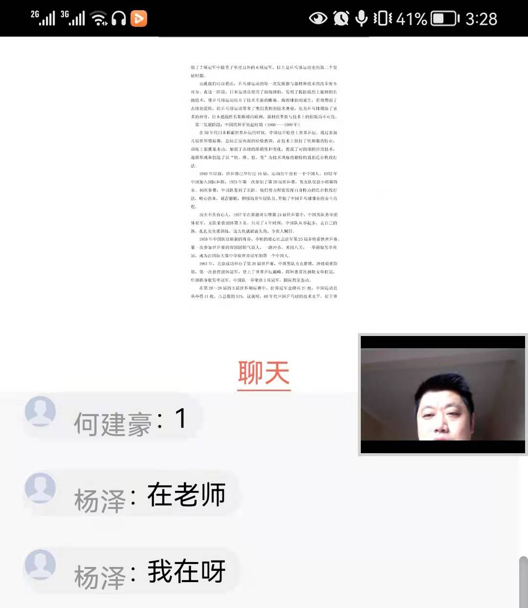 开课第一天,运动训练学院辅导员全部跟班进群,各班班长开课前20分钟发信息督促同学做好上课准备。同学们能积极提前预习上课内容,在线上课程中表现的都很活跃,积极与老师互动配合,不管是在上课前的签到还是老师课上布置练习题,同学们都是积极主动的配合,在老师的讲解过程中,同学们也能主动的提出问题;当老师说到精彩部分的时候,同学们也是毫不吝啬的送上花花给予支持!