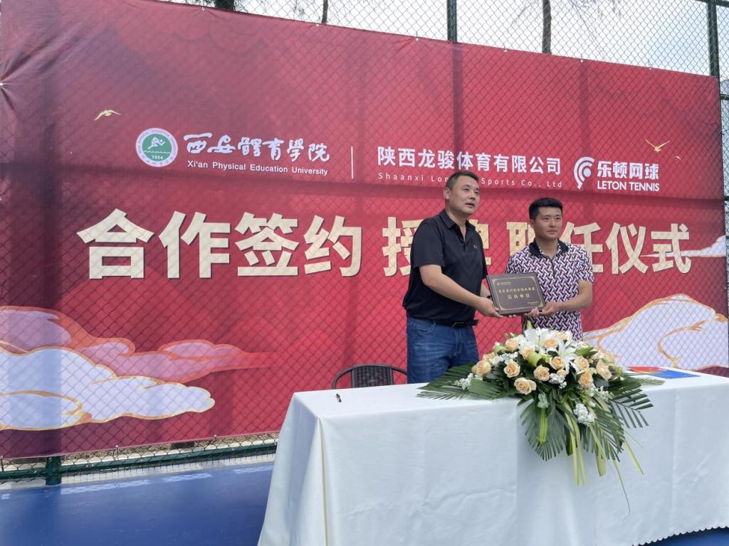 王鑫为西安全满贯体育文化传播有限公司董事长王恒林颁发“实习实训创业就业联盟会员单位”