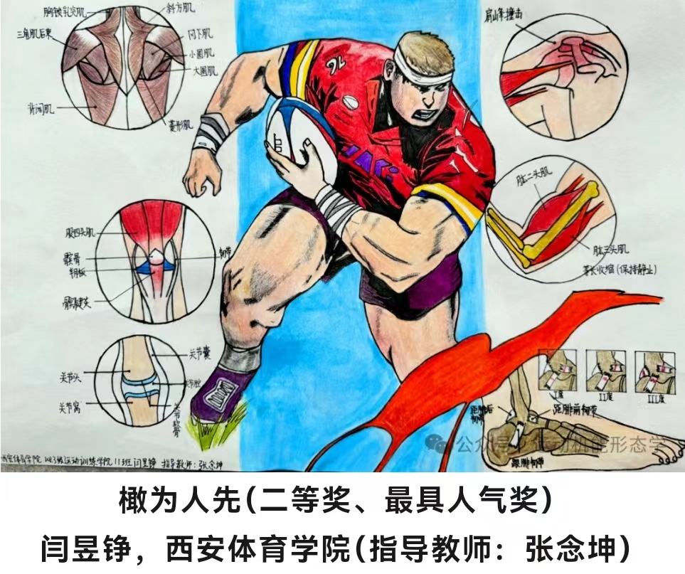 闫昱铮同学是橄榄球国家一级运动员,平时特别喜欢运动解剖学这门课,绘画也是她的爱好。起初,她也胆怯,在张念坤老师的引领和指导下,在同学们的鼓励下,她耐心地审题、认真选材、精心构思,在老师的指导下一次又一次地修改完善,成就了《橄为人先》这一作品。