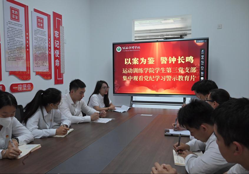为深入学习贯彻习近平总书记关于党纪学习教育重要讲话和重要指示精神,推动党纪学习教育走深走实,运动训练学院学生第三党支部于6月13日中午在鄠邑校区一站式学生社区会议室组织开展“ 以案为鉴,警钟长鸣 ”党纪学习警示教育片观影活动。会议由辅导员李丹主持,全体预备党员参加了本次会议。