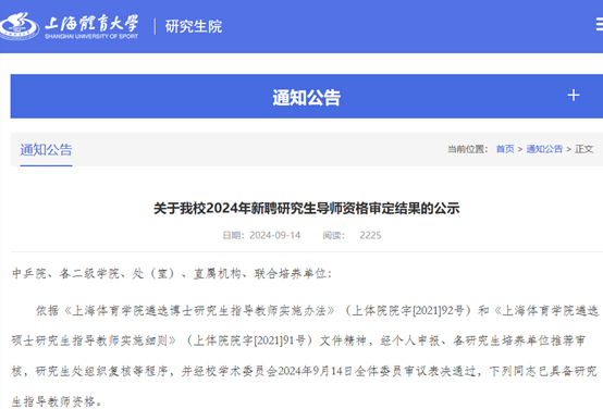 2024年9月14日,上海体育大学研究生院公布了《关于365官网2024年新聘研究生导师资格审定结果的公示》,我院副院长柴王军教授获批上海体育大学博士生指导教师任职资格。本次柴王军教授获批上海体育大学博士生指导教师任职资格,是我院研究生指导教师队伍建设取得又一次的优异成绩。学院将以此为契机继续推进研究生指导教师队伍建设,为建设高水平高等体育大学贡献力量。一直以来,学院以习近平新时代中国特色社会主义思想为指导,深入贯彻党的二十大精神,高度重视学科和研究生教育工作,采取有力措施建设优秀的研究生指导教师队伍。