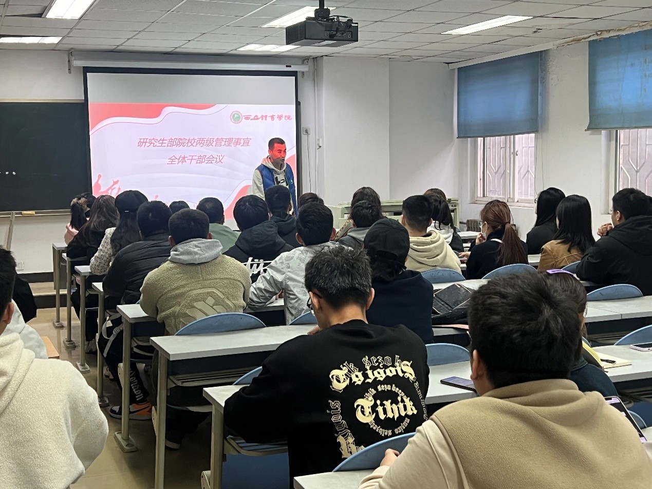 为推进研究生二级管理的顺利下放,2024年3月27日下午18:00,研究生学工办在研109教室就研究生校院两级管理事宜召开了全体干部会议。郭运涛、权毅博、李婷及全体研究生干部参加了本次会议。