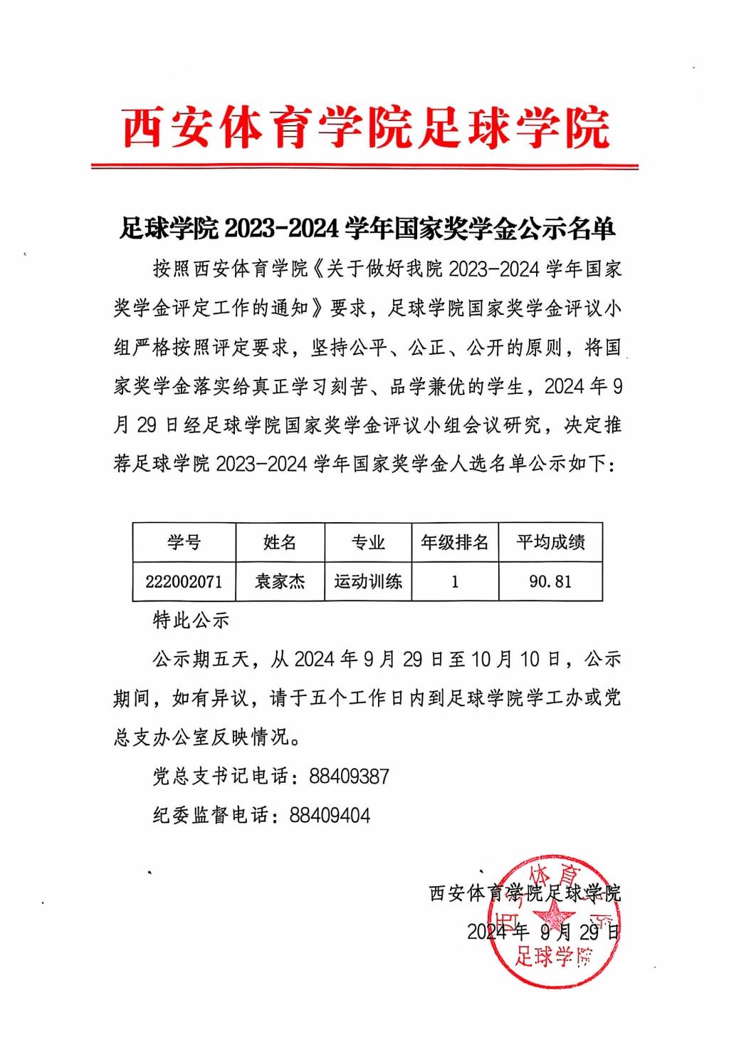足球学院2023-2024学年国家奖学金公示名单