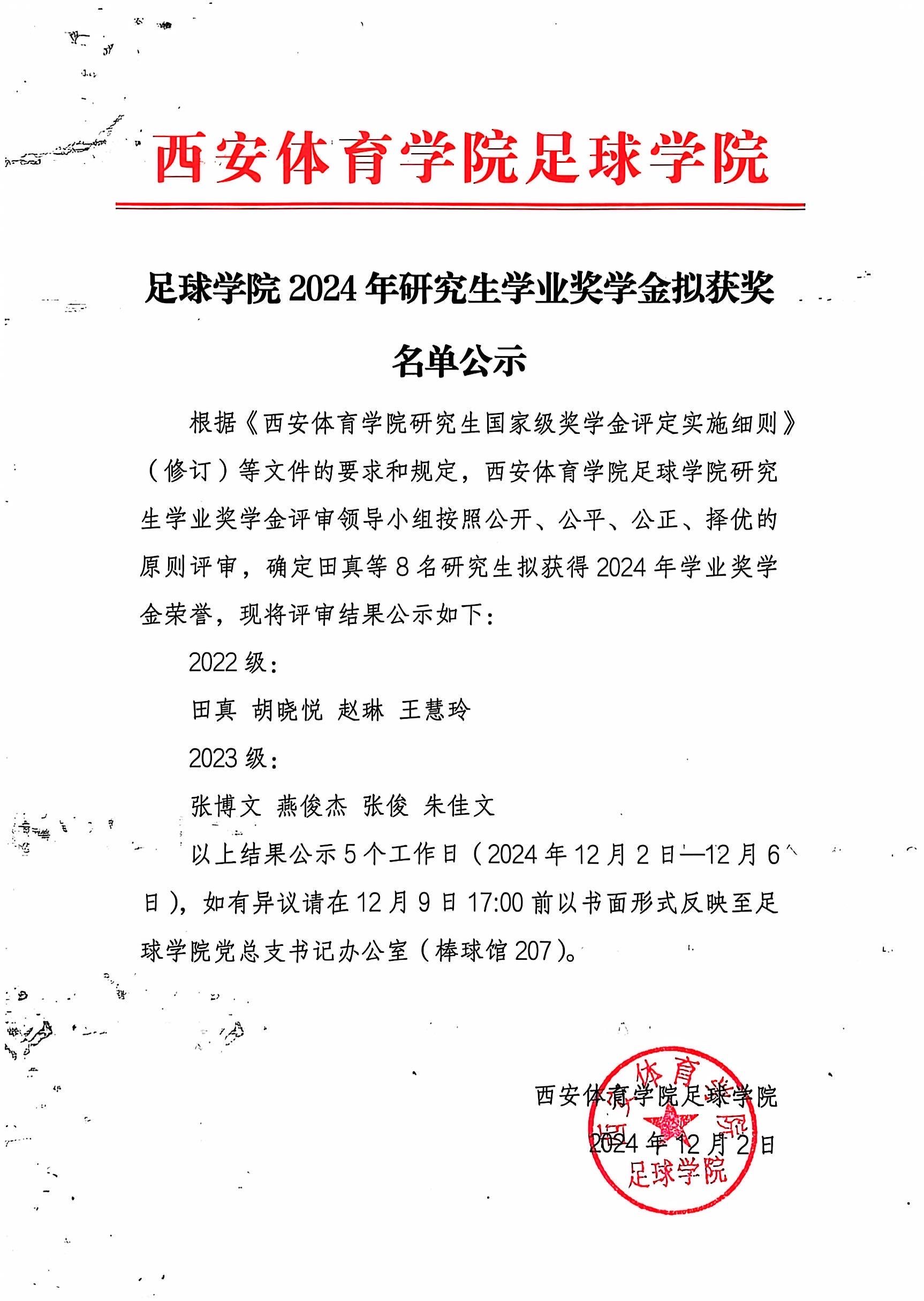 足球学院2024年研究生学业奖学金拟获奖名单公示