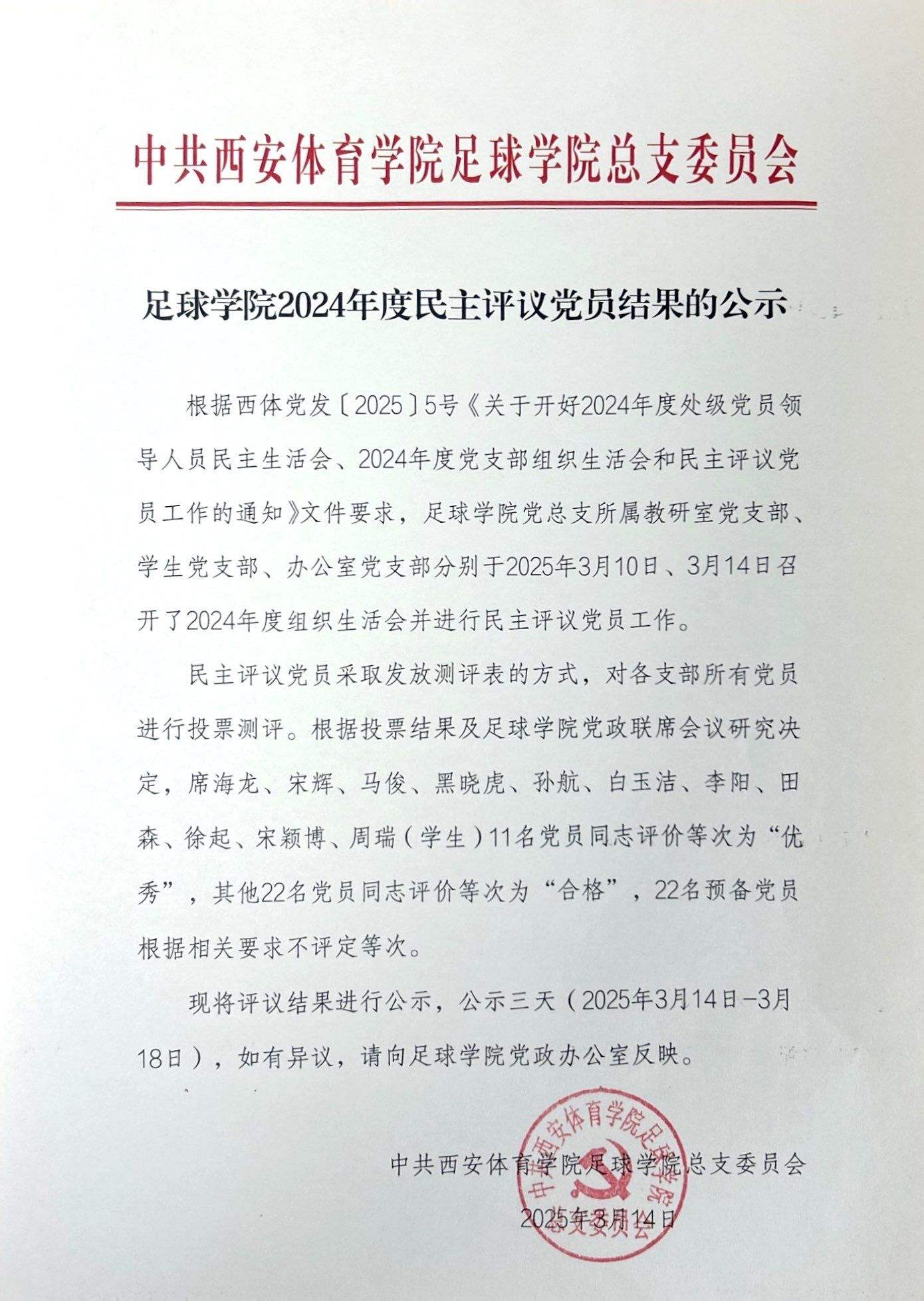 足球学院2024年度民主评议党员结果公示