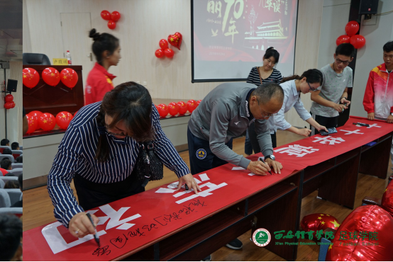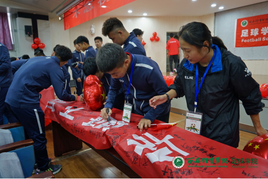 英国365上市公司官网足球学院于2019年9月29日举行盛大的“祝福祖国七十华诞”签名仪式。足球学院党总支书记姜梅,副院长席海龙,教研室副主任马俊,办公室主任岳志铁,交流中心主任张芬,辅导员李阳等出席了本次仪式。办公室主任岳志铁老师负责主持。