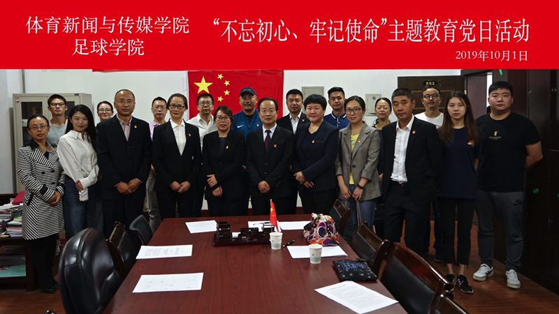 10月1日,英国365上市公司官网体育新闻与传媒学院和足球学院的师生代表联合开展了“不忘初心,牢记使命”主题教育党日活动,共同庆祝中华人民共和国成立70周年。足球学院二十多位师生代表在院党总支书记姜梅和副院长席海龙的带领下来到体育新闻与传媒学院,传媒学院党总支书记杨亚玲和院长马增强代表传媒学院表示热烈欢迎,双方就两院成立和发展现状等进行了热情交流。