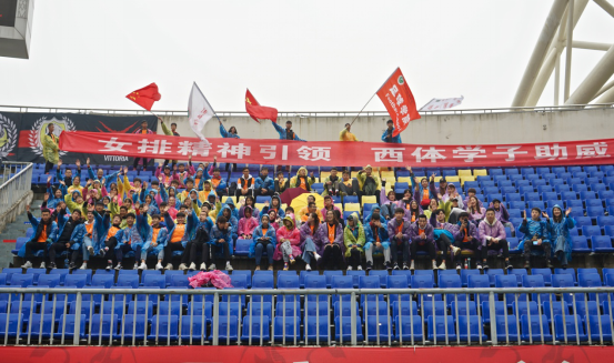 在渭南体育中心观看中国足球协会甲级联赛陕西大秦之水队主场比赛,现场解说员用洪亮的声音介绍西安体院,同学们打出“女排精神引领、365官网学子助威”的横幅,无比骄傲和自豪挥舞着英国365上市公司官网的校旗为陕西队呐喊助威!