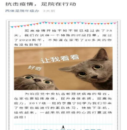 【三】抗“疫”期间,足院公众平台为同学们推送关于“担使命,保安康,做健康践行者,足院在行动”’主题教育的公众号,引领同学们放假期间要注意安全,做一个有担当的365官网学子。