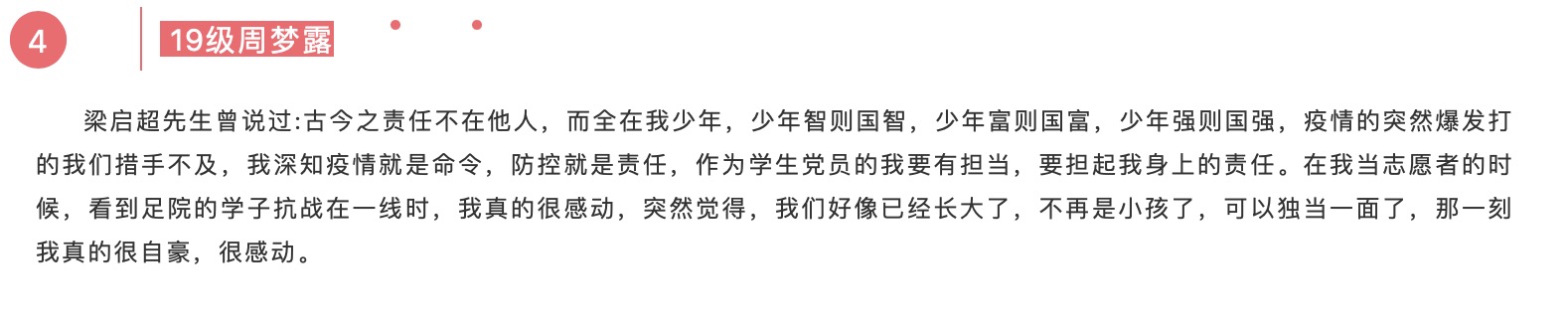 最后,姜梅讲述了2则小故事谈到爱国情怀。在中华民族几千年绵延发展的历史长河中,爱国主义始终是把中华民族团结在一起的精神力量,激励着一代又一代中华儿女为祖国发展繁荣而不懈奋斗。此番疫情,将我们紧紧团结凝聚在一起,共同战疫,更深层次的彰显了“公而忘私,国而忘家”的爱国主义精神。