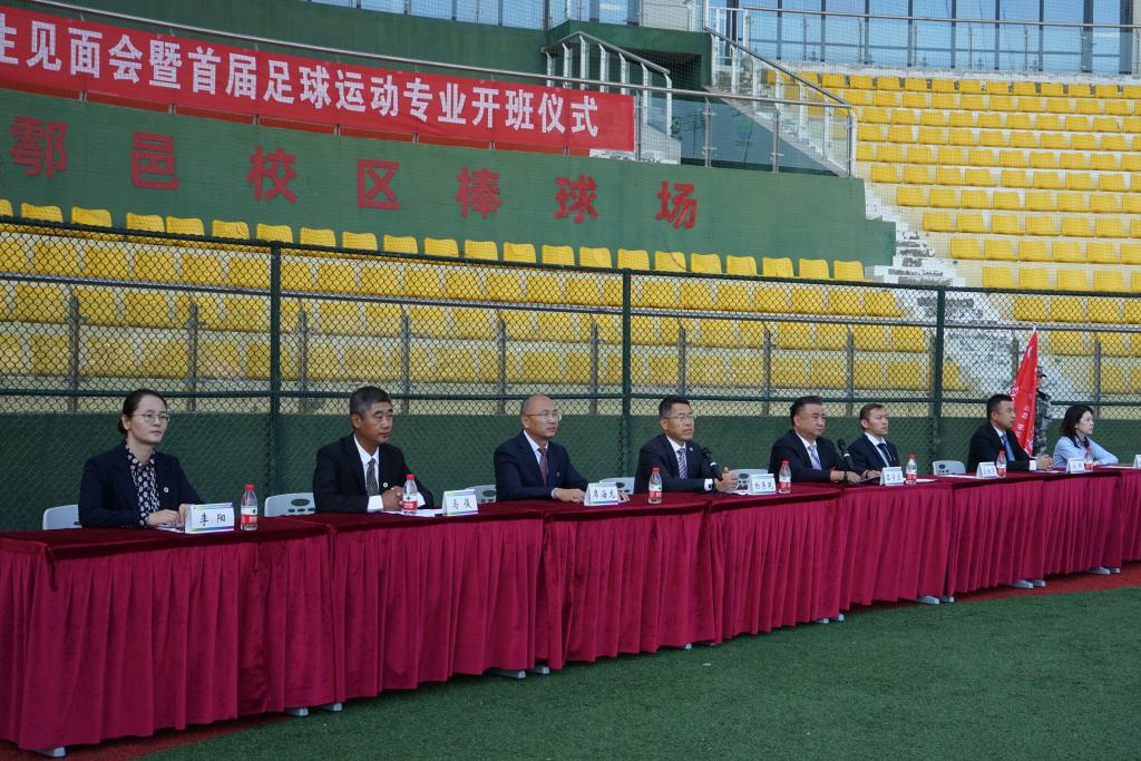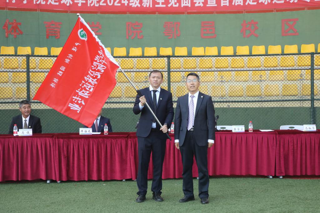 杨芳乾为首届足球运动专业授旗,飘扬的旗帜象征着足球学院的荣耀与新生们的希望。
