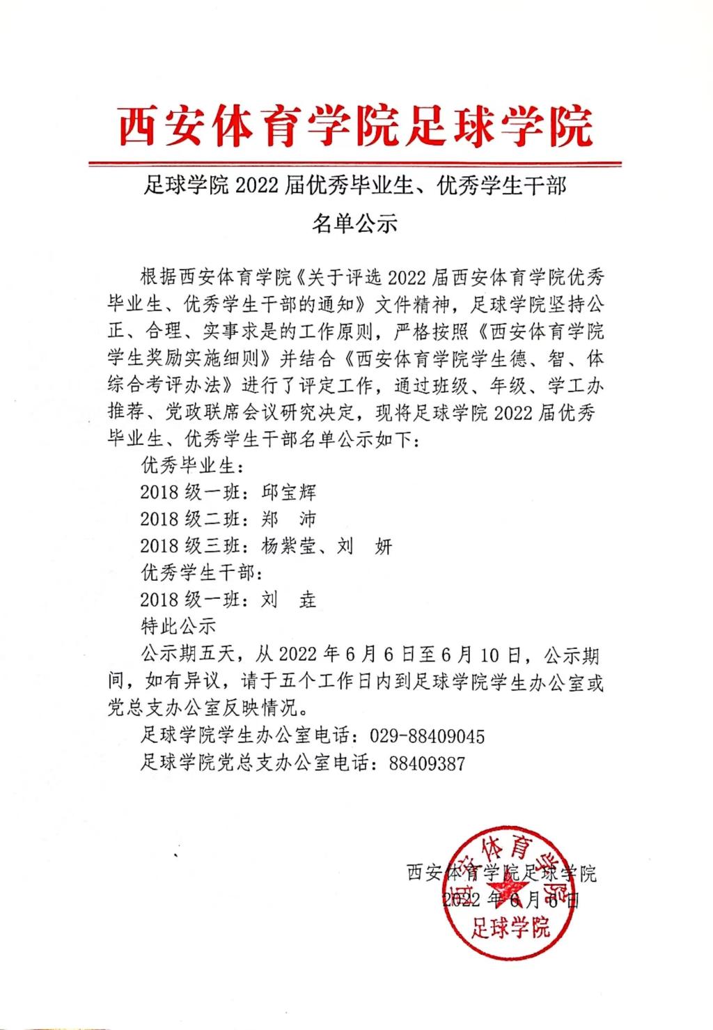 足球学院2022届优秀毕业生、优秀学生干部名单公示