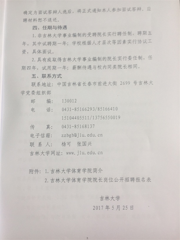 近日,学院收到吉林大学党委组织部发来的关于商请推荐相关学科领域专家学者应聘该校体育学院院长的函件(附招聘公告),现将此函件及招聘公告转发学院相关系、部,请各系部将函件有关精神传达至部门相关人员做好应聘报名工作。